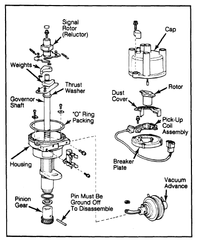 On other models, the transistorized ignitor is mounted on the ignition coil housing. Distributors contain both centrifugal and vacuum advance mechanisms.
