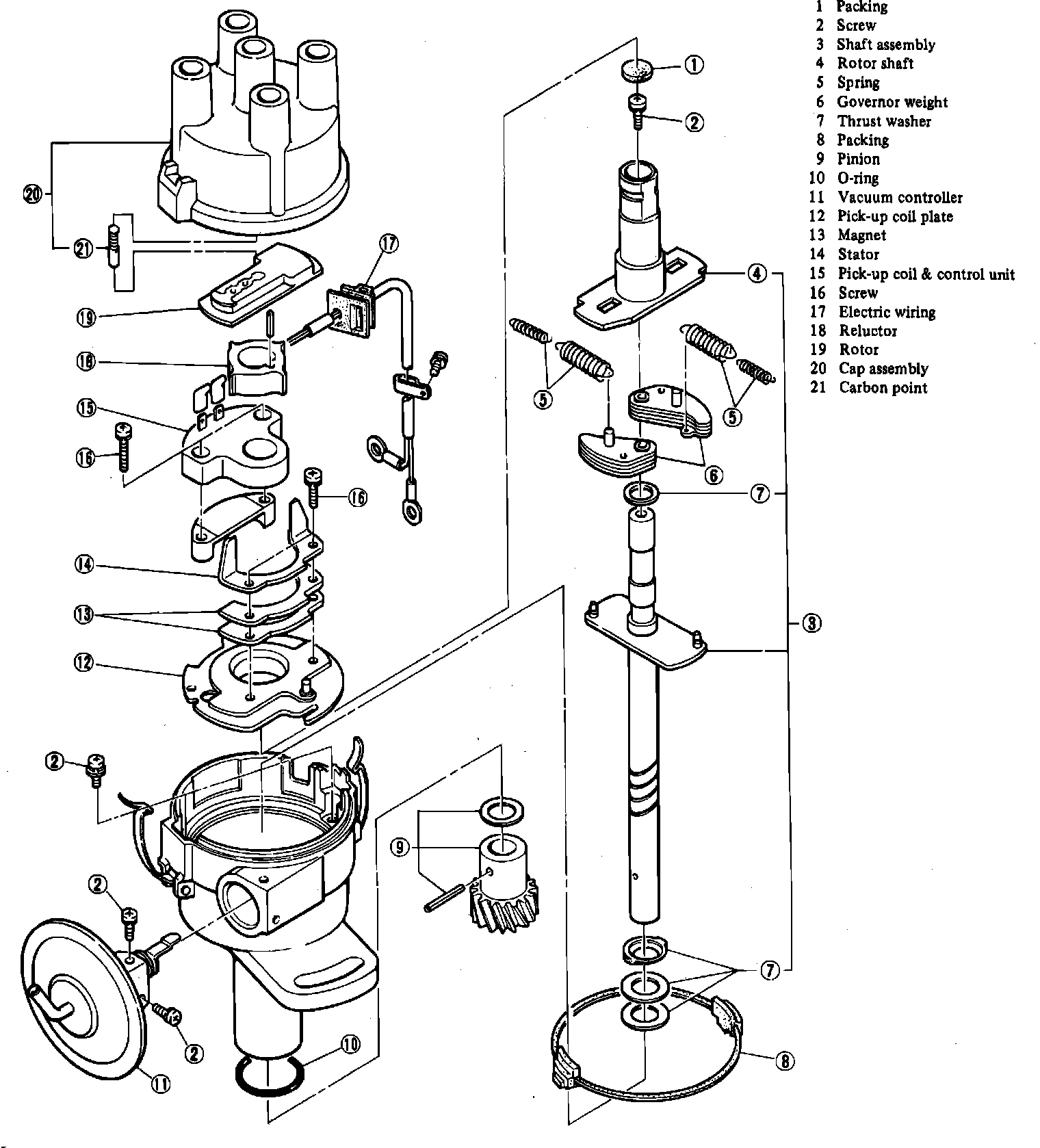 Fig.3 Hitachi breakerless type distributor. Exploded view. Except Turbocharged engines.: