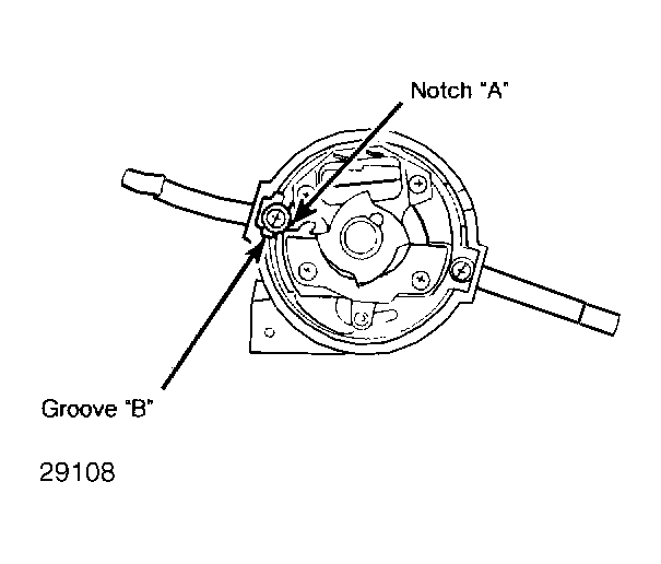 - Align match mark "A" on pinion gear with right side of notch "B" on lower end of housing. See Fig 2.