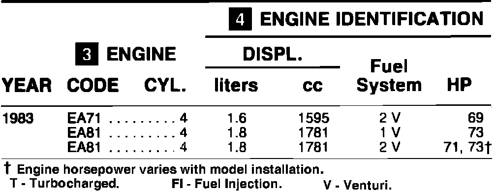 Home >> Subaru >> 1983 >> Hatchback 2WD F4-1781cc 1.8L >> Repair and Diagnosis >> Powertrain Management >> Application and ID >> Engine Code Identification