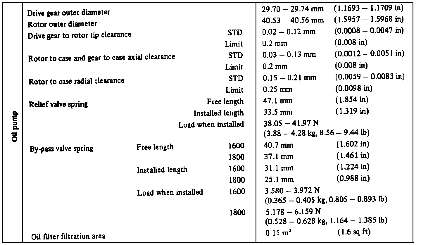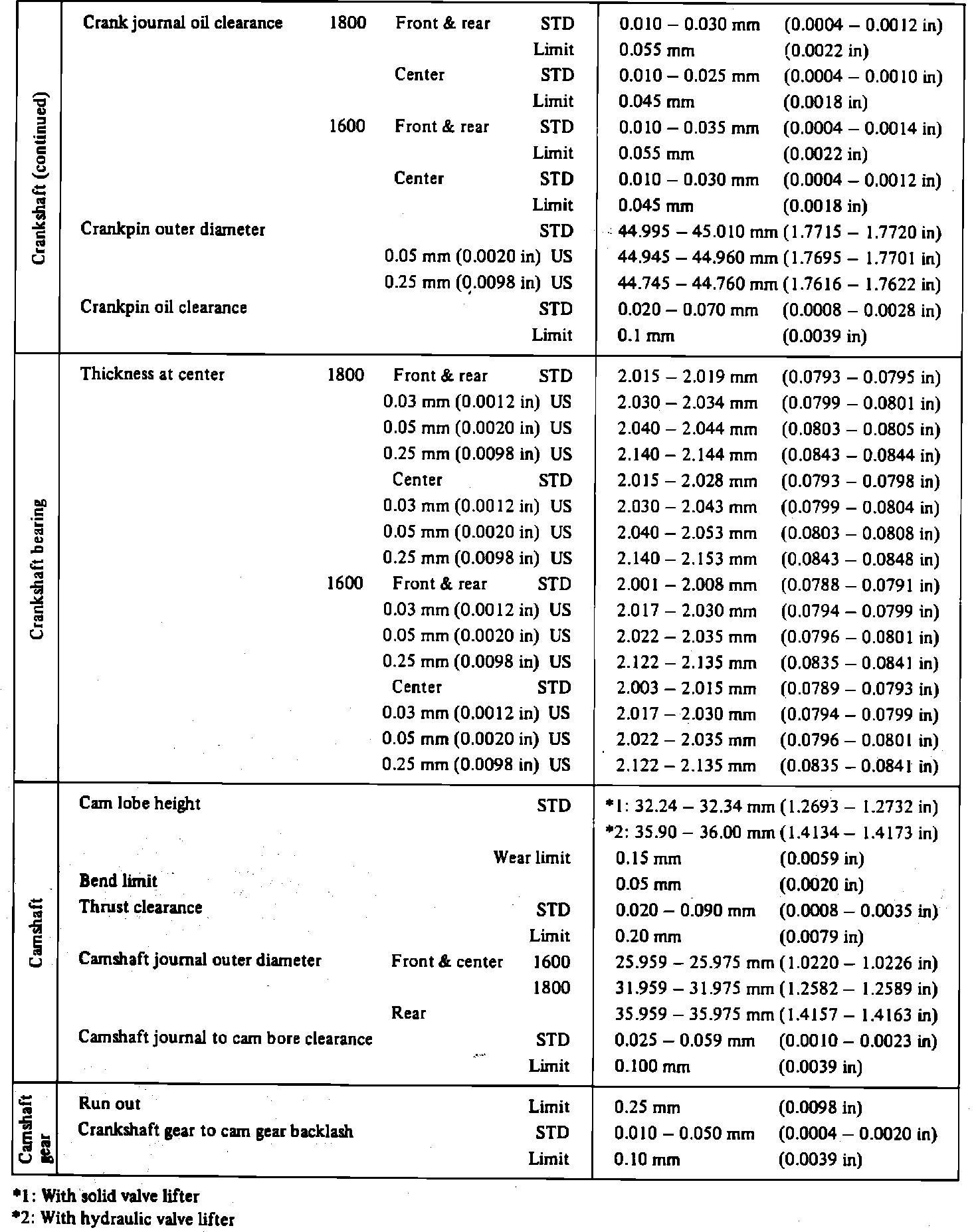 Engine Service Data (Crankshaft, Camshaft & bearings):