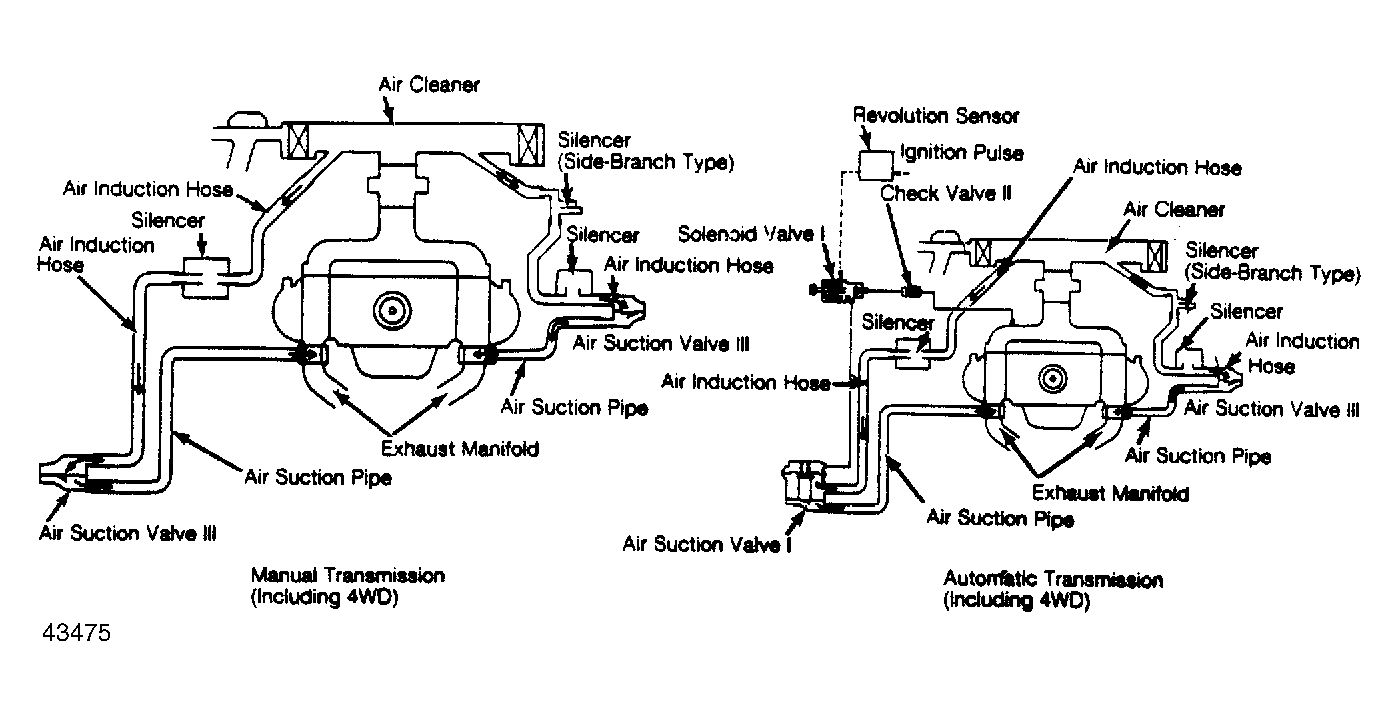 On 4WD models with automatic transmission, fresh air is supplied to the exhaust ports of No. 1/No. 3 cylinder sides by ASV-I with cut-off valve. Fresh air is supplied to exhaust ports of No. 2/No. 4 cylinder sides by ASV-III without cut-off valve. See Fig 1 .