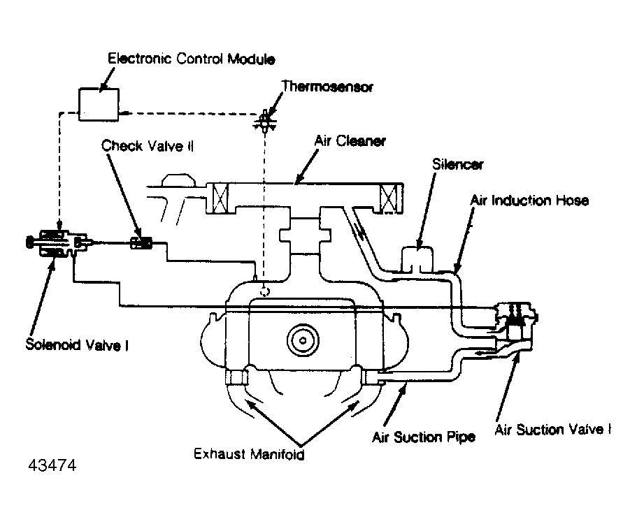 Secondary (fresh) air is supplied to the exhaust port on the No. 2 and No. 4 cylinder side by the air suction valve (ASV-I) with cut-off valve. The air injection system is controlled by both coolant temperature sensed by the thermosensor and time governed by the ECM.