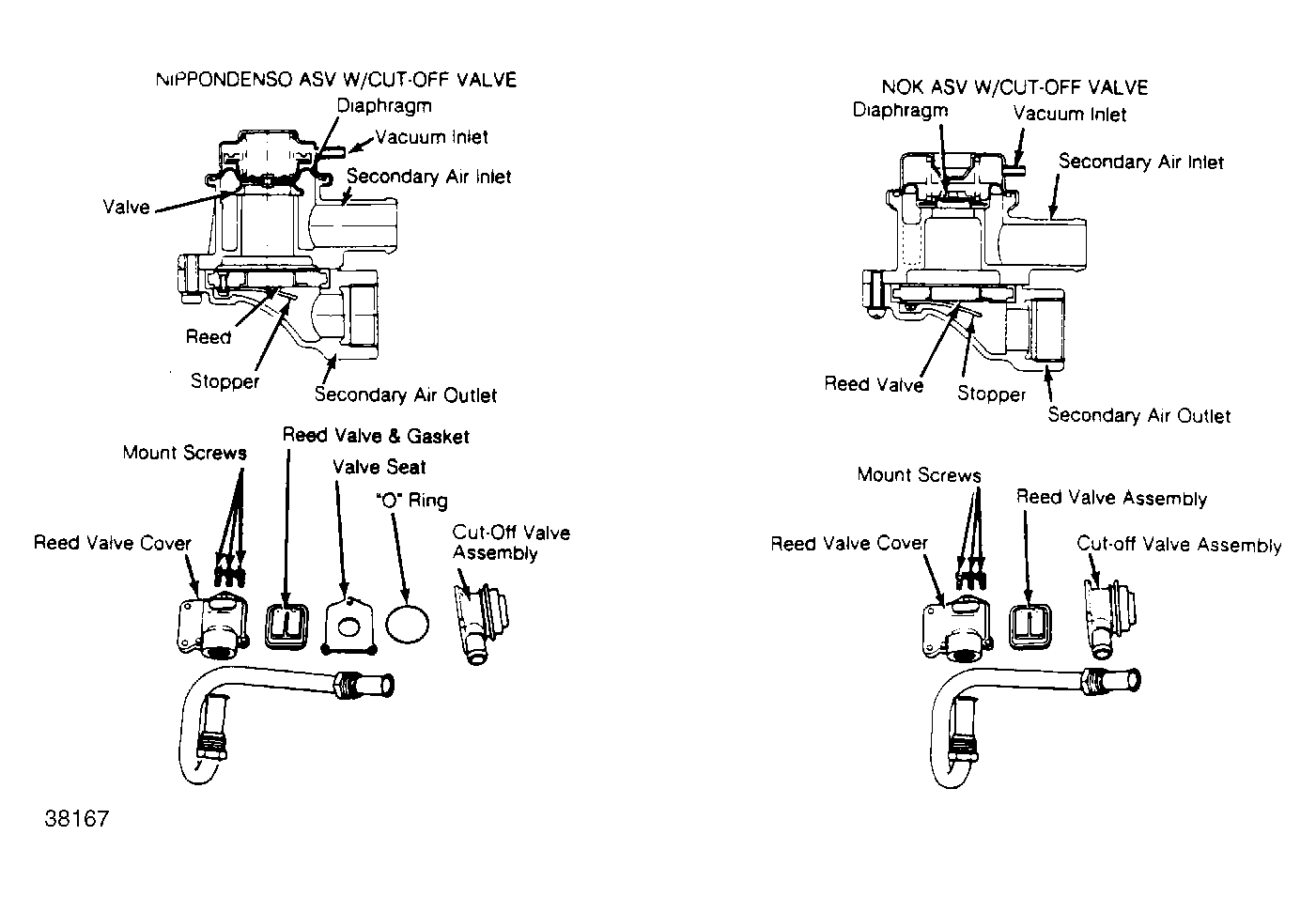 Fig 1: Sectional and Exploded View of Nippondenso and NOK AIR Suction Valves Used on Federal 2WD and all California models.