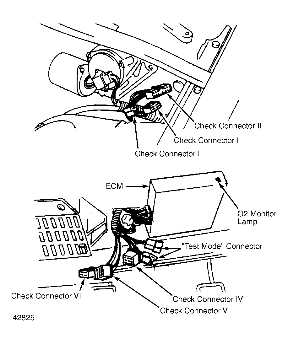 Fig 1: ECC Test Connector Locations Connectors I, II and III are located near windshield wiper motor in engine compartment. Connectors IV, V and VI are located below steering column.