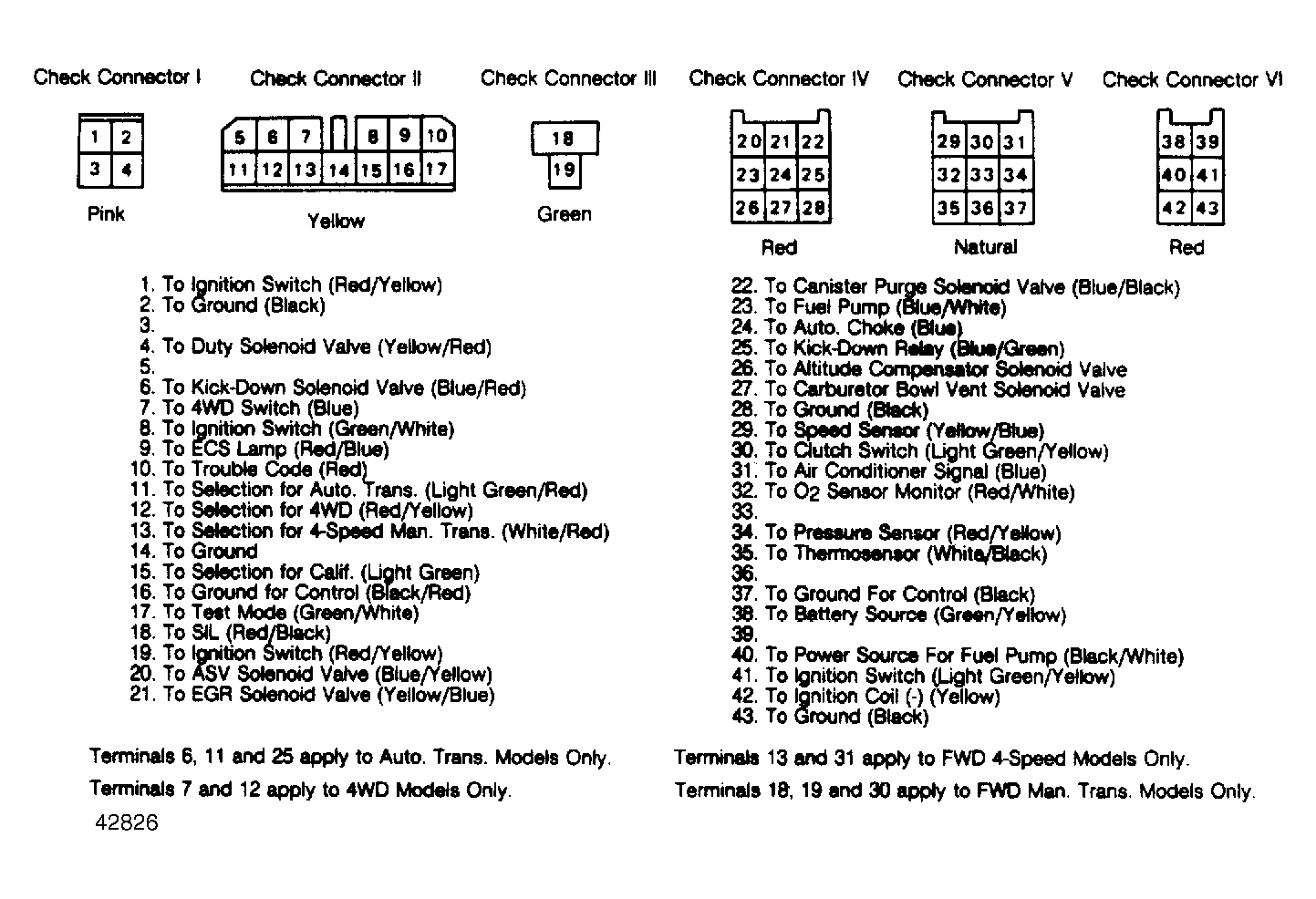 The ECC system requires a circuit tester, stethoscope and a dry cell battery for diagnosis. The circuit tester is used to measure voltage and resistance of check connectors I-VI. See Fig 1 and Fig 2 . It is also used to measure resistance of duty solenoids and vacuum sensor after lead connectors are unplugged. The stethoscope or vinyl tube is used to check operating sound from duty solenoid valves. The dry cell battery is used to test O2 sensor and its wiring for defects.