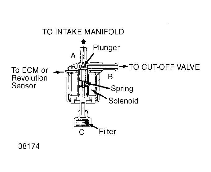 NOTE: With current off, solenoid valve plunger is forced upward by spring pressure, closing off passage between "A" and "B" and opening passage between "B" and "C". With current on, plunger is attracted downward, opening passage between "A" and "B" and closing passage between "B" and "C". See Fig 1 .