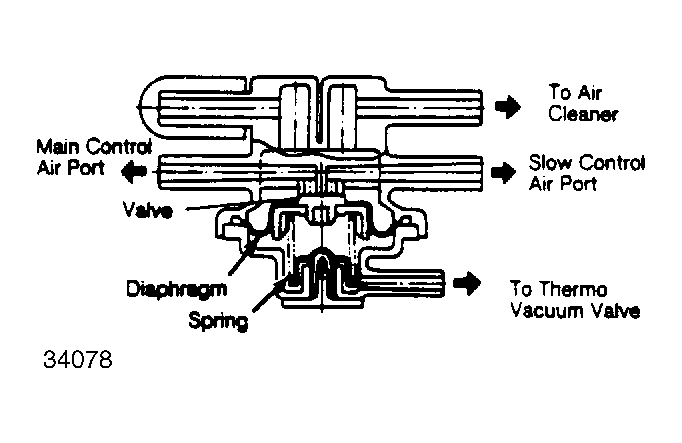 - Using a vacuum pump, apply 7.9-19.7 in. Hg to valve's port to thermo vacuum valve. With vacuum applied, seal main control air port with finger. Blow air into slow control air port and check that air flows freely through valve.