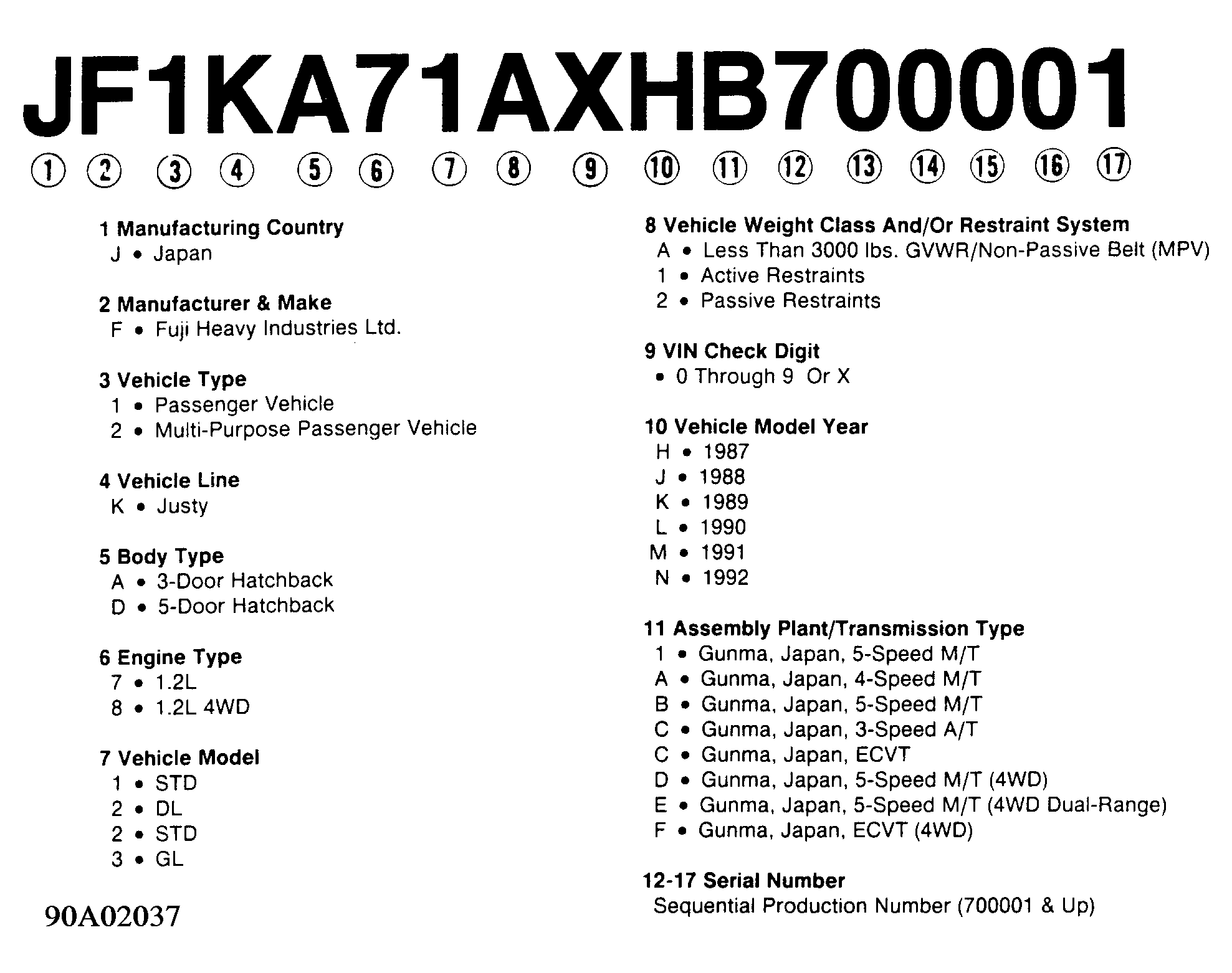 Home >> Subaru >> 1987 >> Justy GL >> Repair and Diagnosis >> Engine Performance >> Application >> Engine/VIN Id >> Model Identification >> VIN Code Id Explanation