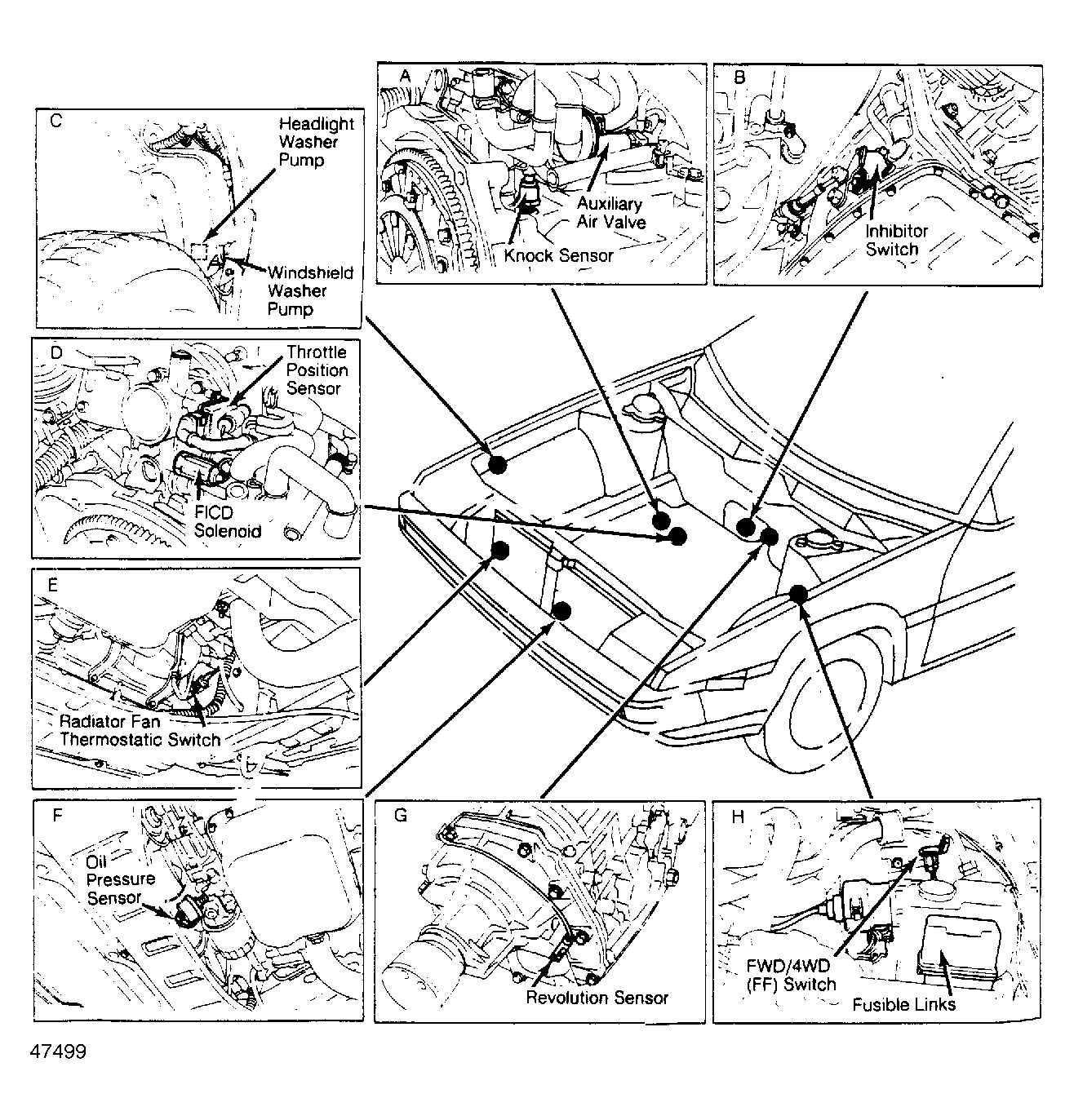 | Fusible Links | On left fender panel, in front of strut tower. See Figure . |