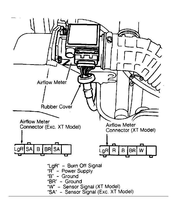 - Turn ignition on (engine off). Connect airflow meter connector. Measure voltage across power terminal "R" on XT models ("SA" on Wagon, Coupe and Sedan models) and body. Reading should be 10 volts minimum.