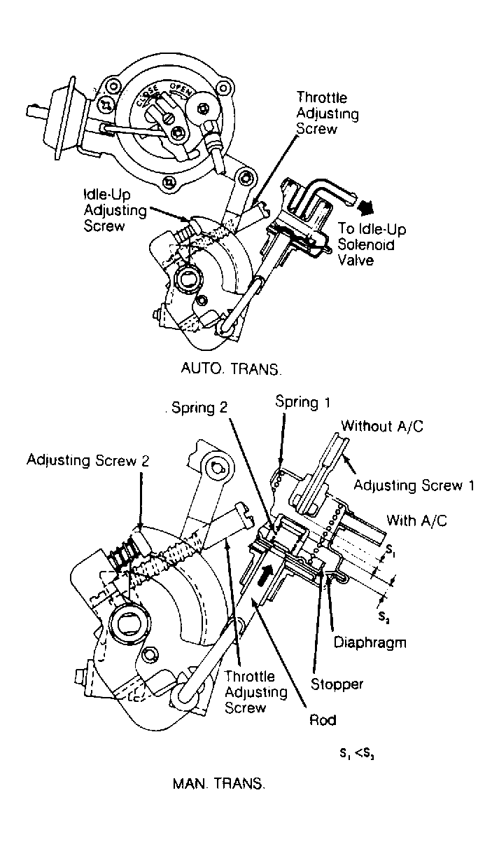 . On all models, ensure vacuum is applied to idle-up actuator. If necessary, check and adjust actuator so it opens .030" (.76 mm) man. trans. or .034" (.86 mm) on auto. trans. models. See Fig 2