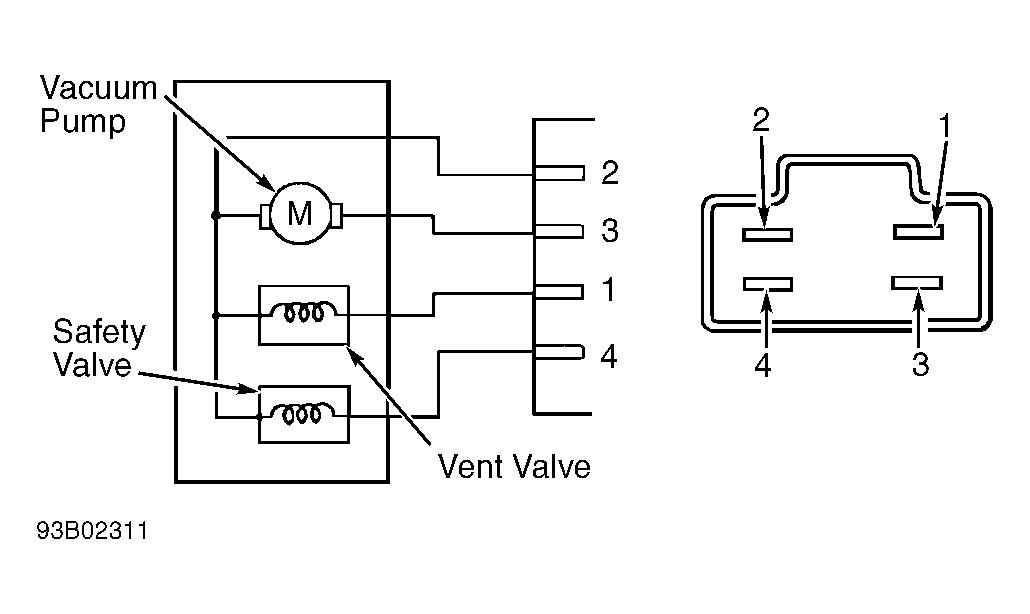 - Turn off engine. Disconnect electrical connector from vacuum pump and valve assembly. Apply battery positive lead to terminal No. 2, and negative lead to terminals No. 1 and 4. SeeFig 1 . Ground terminal No. 3. If throttle does not fully open within 3 seconds, replace vacuum pump and valve assembly.
