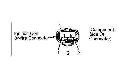 - Disconnect 3-wire connector from ignition coil assembly. Using an ohmmeter, check primary resistance between terminals No. 1 and 2 for one coil. See Fig 1