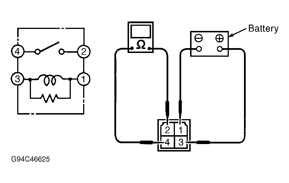 To access relay, remove passenger-side seat. Remove cover side plate and roll up floor mat. Remove relay. Using ohmmeter, check continuity between relay terminals. See Fig 1 . Continuity should be present between terminals No. 1 and 3. With battery voltage applied to terminals No. 1 and 3, continuity should not be present between terminals No. 2 and 4.