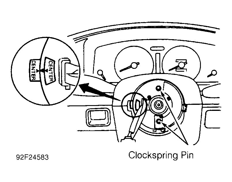 Ensure wheels are in a straight-ahead position. With air bag module and steering wheel removed, turn clockspring pin clockwise until it stops. See Fig 1 . Then turn clockspring pin counterclockwise approximately 2 1/2 turns until the word CENTER appears in indicator. Align arrow marks. See Fig 1 . Clockspring is now centered. Install steering wheel and air bag module. Turn steering wheel fully in both directions to ensure steering is normal.