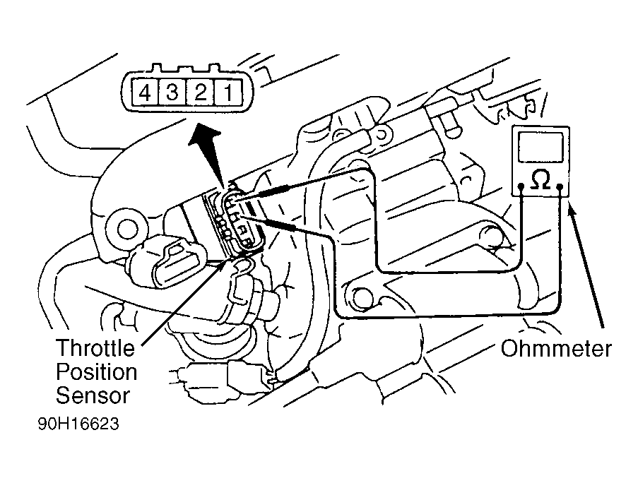 With engine off, unplug TPS connector, located at throttle body. Measure and record resistance between terminals No. 2 and 3 with throttle fully closed. See Fig 1 . Measure and record resistance between terminals No. 2 and 4 with throttle fully closed, then with throttle fully open. If readings are not as specified, replace throttle position sensor. See 4-CYLINDER THROTTLE POSITION SENSOR RESISTANCE table.