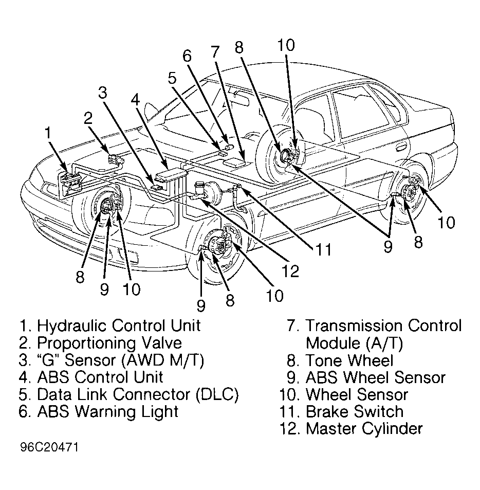 Anti-Lock Brake System (ABS) is designed to prevent wheel lock-up during heavy braking. ABS electronically controls brake fluid pressure, reducing chance of wheel lock-up. This allows driver to maintain better steering control of vehicle. Major components of ABS system are 4 wheel speed sensors, 4 tone wheels, ABS control unit, hydraulic unit and ABS warning light. See Fig 1 .