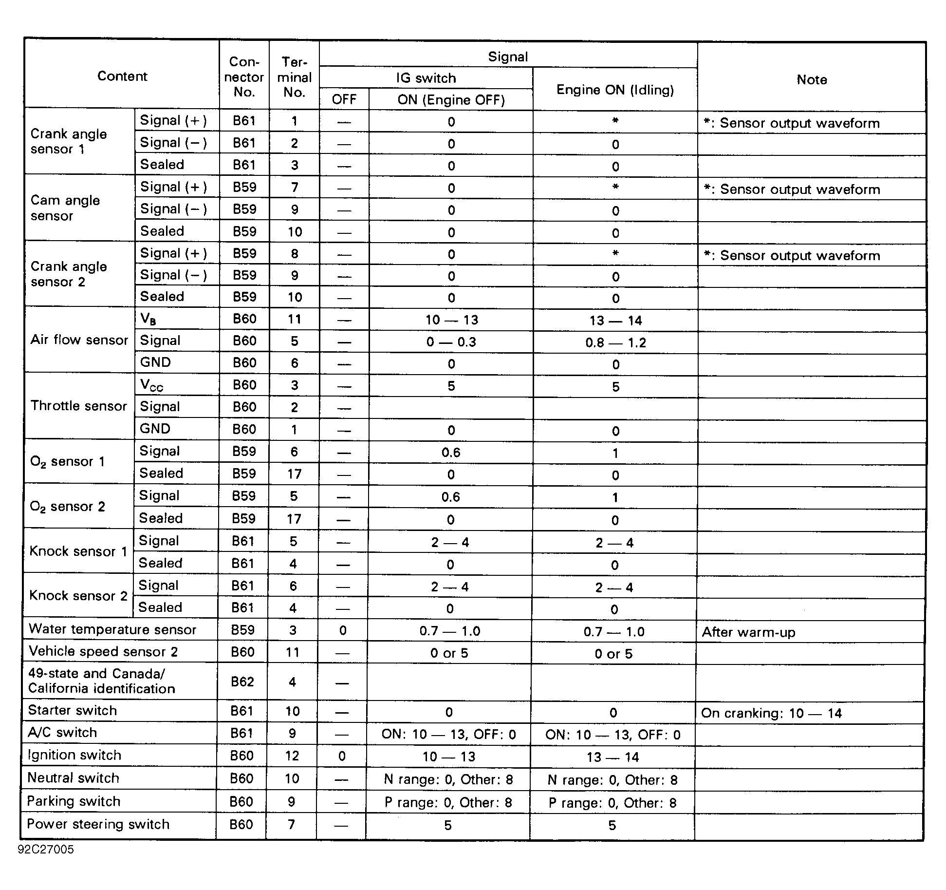 - ECU circuits are checked at ECU connector under one or more of the following conditions: ignition off, ignition on and engine off, or ignition on and engine running.