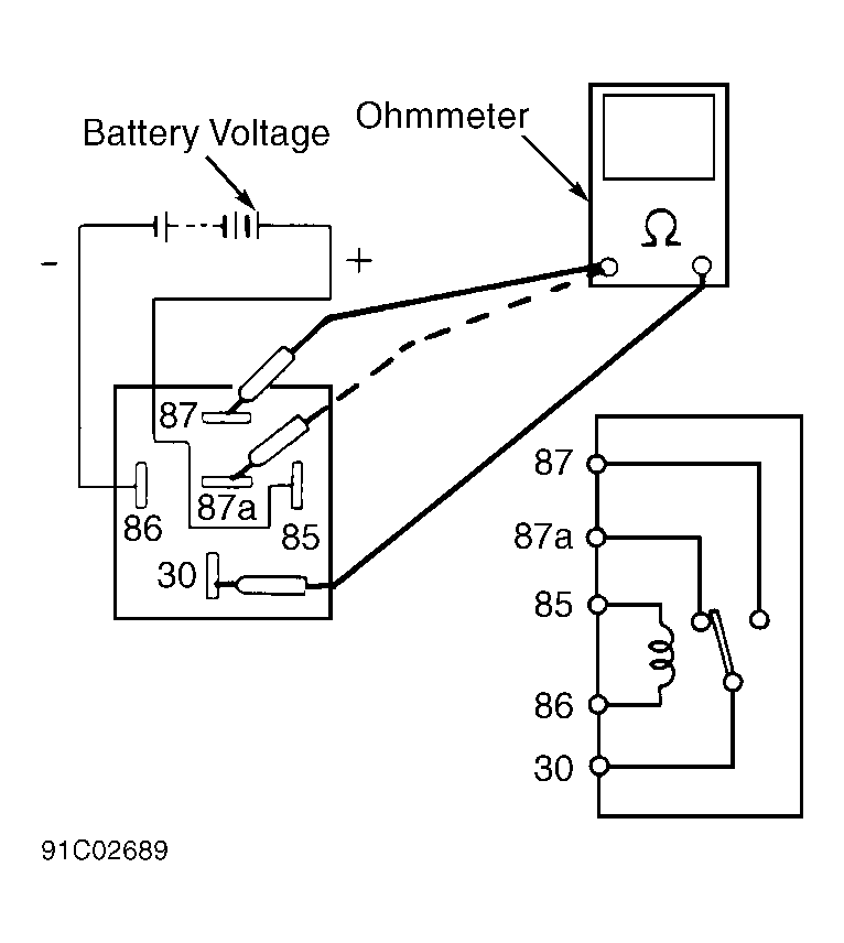 . With battery voltage connected between terminals No. 85 and 86, continuity should exist between terminals No. 30 and 87. Continuity should not exist between terminals No. 30 and 87a. Without battery voltage applied, continuity should exist between terminals No. 30 and 87a. Continuity should not exist between terminals No. 30 and 87. If continuity is not as specified, replace relay. If relay is okay, recheck codes. If no other codes exist, replace hydraulic unit.