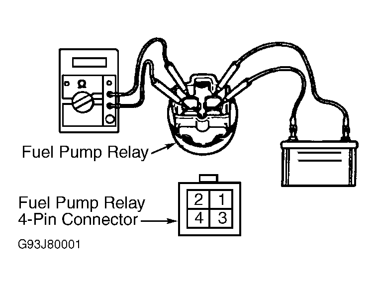- Disconnect fuel pump relay connector and main relay. Remove fuel pump relay and main relay from bracket. Connect battery voltage and ground to fuel pump relay terminals No. 1 and 3. Ensure there is less than 10 ohms resistance between terminals No. 2 and 4. If resistance is less than 10 ohms, go to next step. If resistance is greater than 10 ohms, replace fuel pump relay. See Fig 1