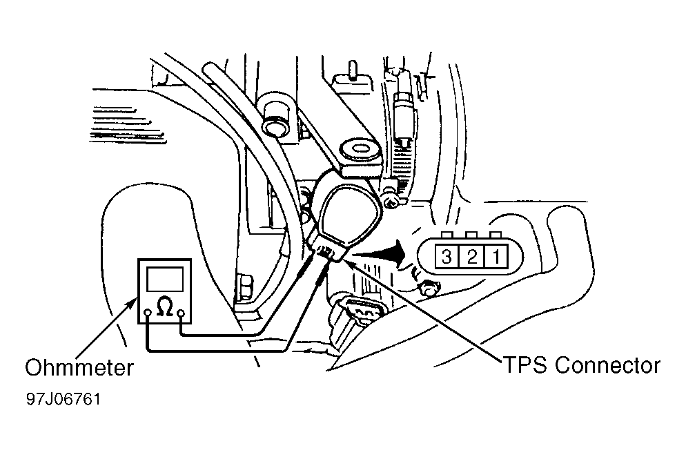 - With ignition off, unplug TP sensor harness connector. Check and record resistance between TP sensor terminals No. 1 and 3 with throttle fully closed. See Fig 1 .