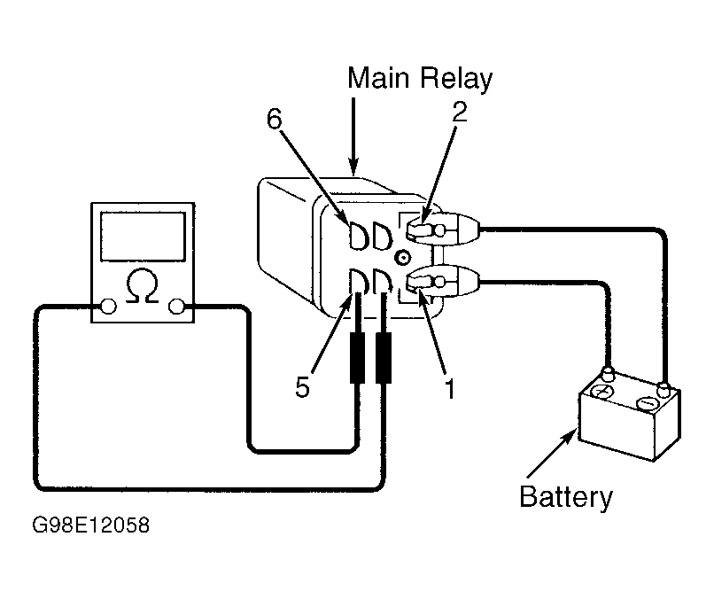 Turn ignition off. Remove main relay. Connect battery voltage to main relay terminals No. 1 and 2. Check resistance between main relay terminals No. 3 and 5, and terminals No. 4 and 6. See Fig 1. Resistance should be less than 10 ohms in both tests. If resistance is as specified, go to next step. If resistance is not as specified, replace main relay.