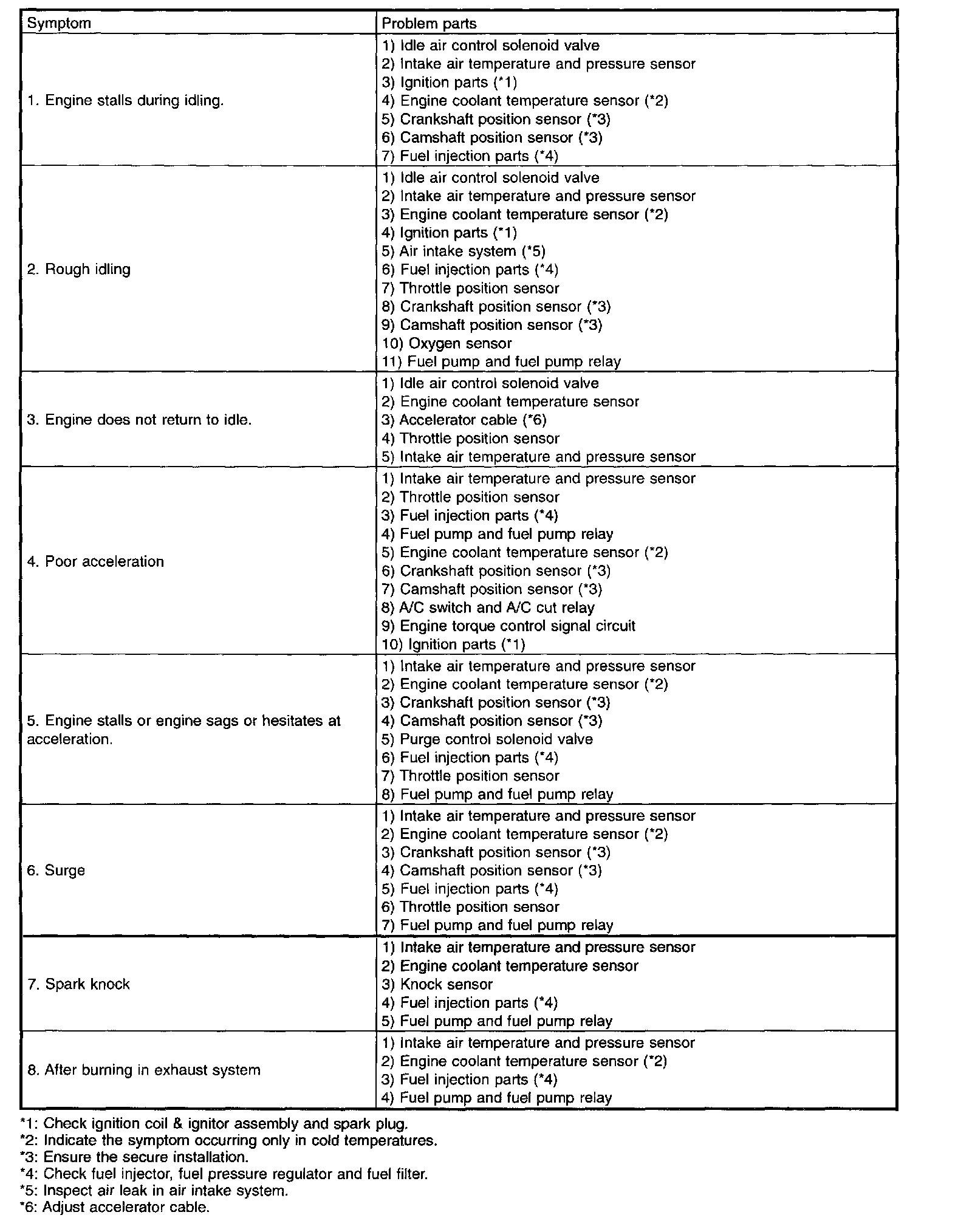 Malfunction of parts other than those listed is also possible.