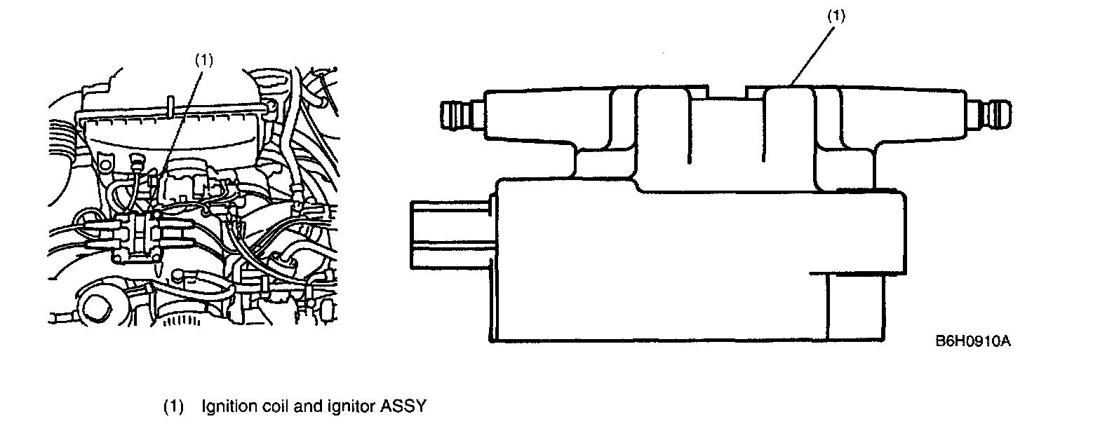 The ignition system is of a 2-cylinder simultaneous ignition design. In response to the signal from the ECM, the ignitor supplies another signal to the ignition coil to ignite a pair of cylinders #1 and #2 or #3 and #4 simultaneously.