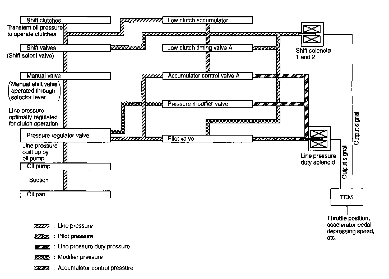 - The pilot pressure applied to the pressure modifier valve is regulated by the line pressure controlling duty solenoid A (line pressure) and changed into the pressure modifier pressure.