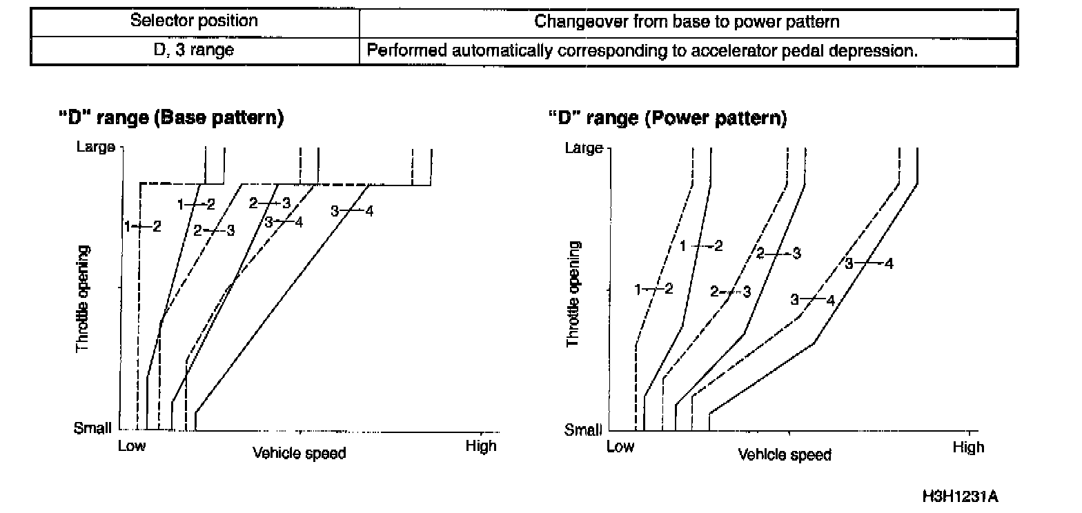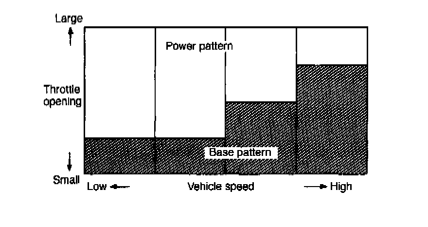 The power pattern is shifted to the normal pattern, depending on car speed. Shifting to the normal pattern is determined by the throttle position as shown in Figure below. Time lag in shifting is also determined by car speed. The maximum time lag is 3 seconds.