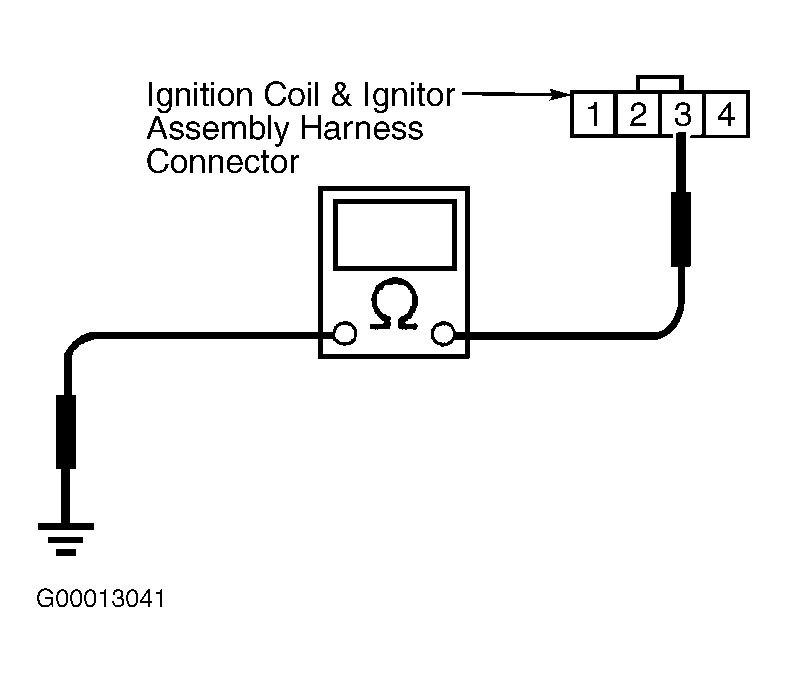Turn ignition off. Disconnect connector from ignition coil and ignitor assembly. Measure resistance between ignition coil and ignitor assembly harness connector (ECM side) terminal No. 3 and ground. See Fig 1. If resistance is less than 5 ohms, go to next step. If resistance is 5 ohms or more, repair open circuit in harness between coil and ignitor assembly and ground. See appropriate wiring diagram in WIRING DIAGRAMS article. - Check Ignition Coil & Ignitor Assembly