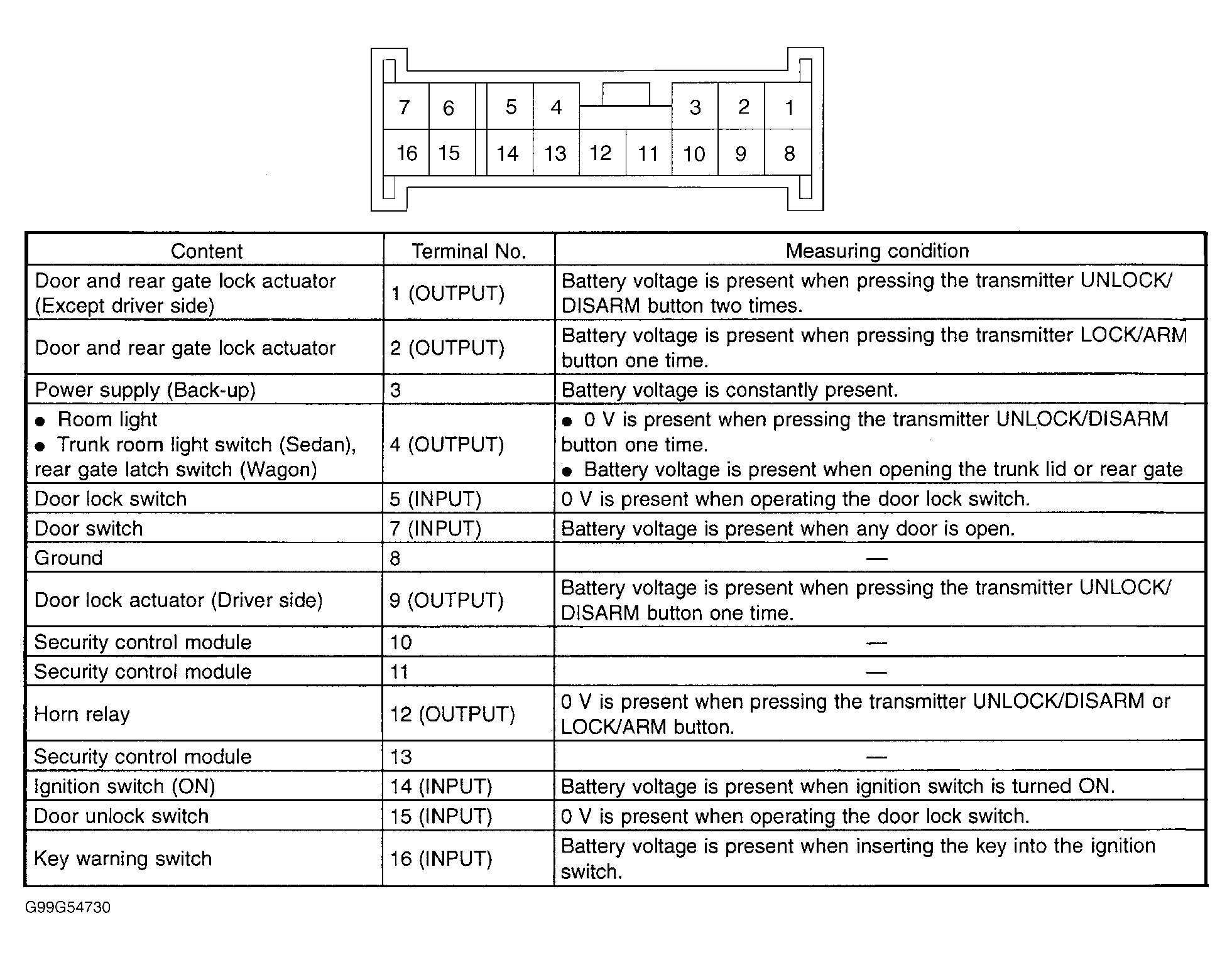 - Disconnect keyless entry control module harness connector. Check voltage between ground and keyless entry control module harness connector terminal No. 3. If voltage is 10 volts or greater, go to next step. If voltage is less than 10 volts, repair circuit between keyless entry control module and fuse box.