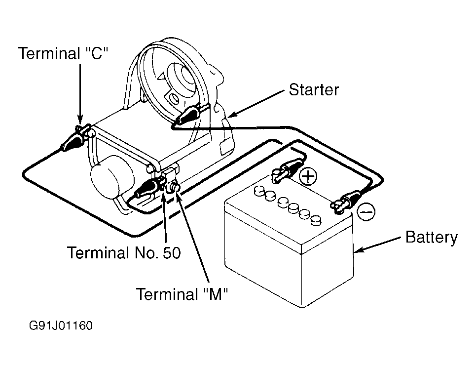 Connect jumper wire from negative battery terminal to starter solenoid case. Connect another jumper wire from negative battery terminal to starter solenoid terminal "C". See Fig 1. Pinion should extend when jumper wire from battery positive terminal is connected to solenoid terminal No. 50. If pinion does not extend as specified, replace starter.