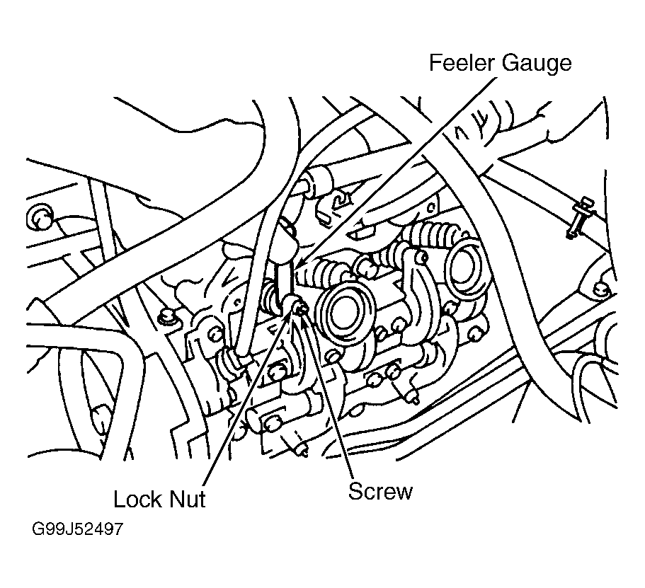- Set cylinder No. 1 to TDC of compression stroke by aligning arrow mark on left side camshaft sprocket to straight up position. See Fig 1. Using feeler gauge, measure cylinder No. 1 valve clearance. Loosen lock nut and turn screw to adjust clearance as needed. See Fig 2. See VALVE CLEARANCE SPECIFICATION table. After adjustment, tighten lock nut to 80-97 INCH lbs. (9-10 N.m).VALVE CLEARANCE SPECIFICATION