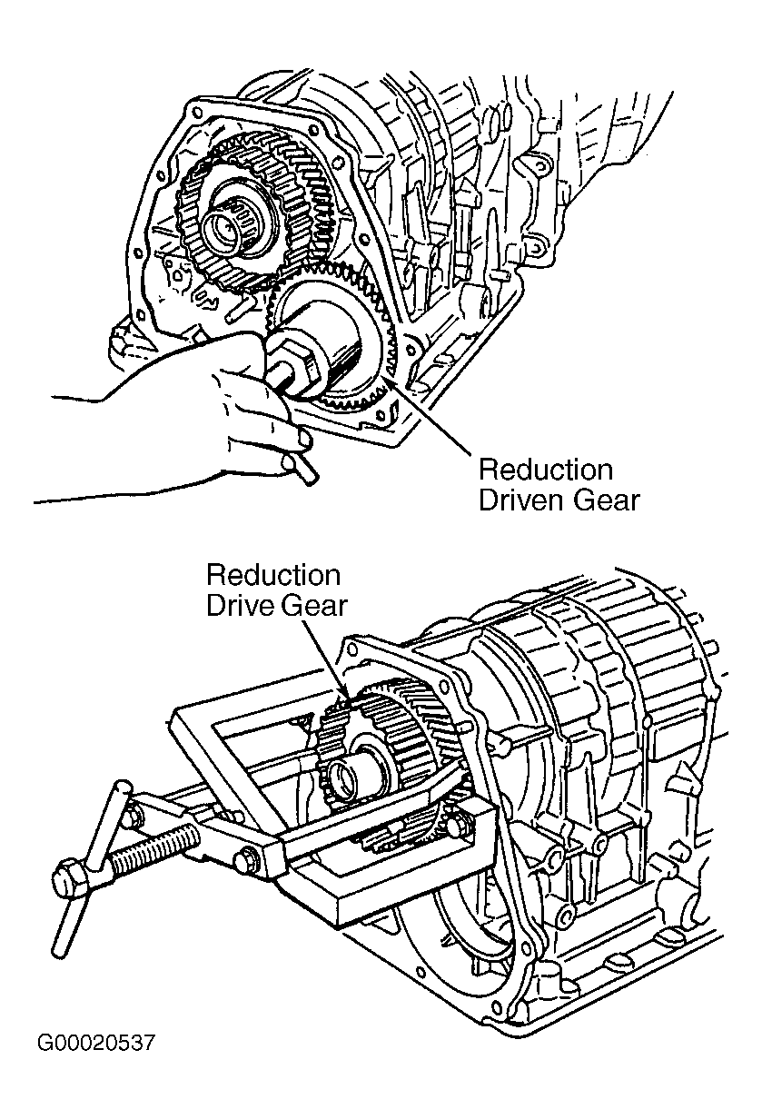 - Place transaxle in "P" position. Remove reduction drive gear assembly from rear of transaxle case by unstaking and removing reduction driven gear lock nut. Using Special Puller Tools (499737000), (899524100) and (499737100), remove reduction drive gear. See Fig 1 .