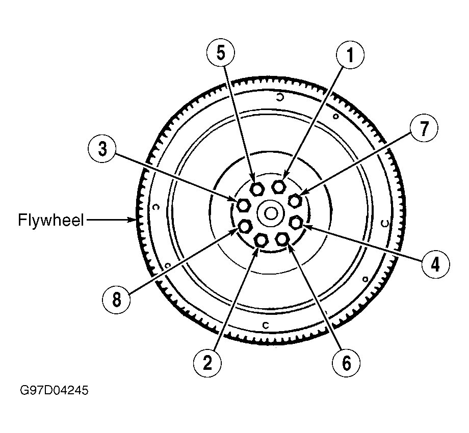 - If installing NEW pilot bearing, press bearing into flywheel until bearing surface is flush with clutch disc side of flywheel. Tighten flywheel bolts in sequence. See Fig 1
