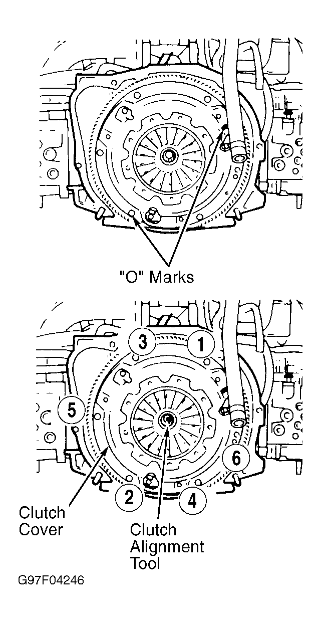 . Use clutch alignment tool to position clutch disc against flywheel. Position pressure plate against disc. Ensure "O" marks located on flywheel and pressure plate are 120 degrees or more apart from each other. Tighten pressure plate bolts in sequence. See Fig 2