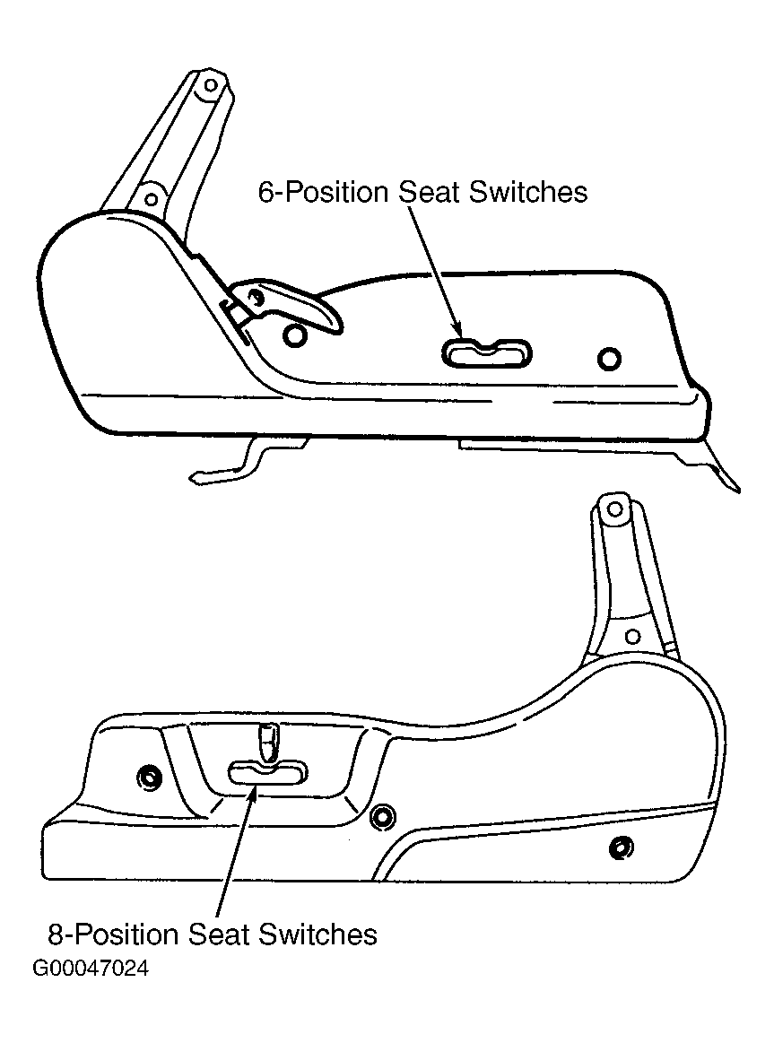 Seat movements are controlled by 6-position or 8-position switches. Switches are located on door side of lower seat cushion. See Fig 1 . On all models, seat switch controls seat forward, rearward, front up and down and rear up and down. On models equipped with 8-position switches, a second seat switch controls forward and rearward backrest reclining. See Fig 1 . Optional heated seat controls are located on left side of instrument panel. Power seat adjustment motors are located under seat.