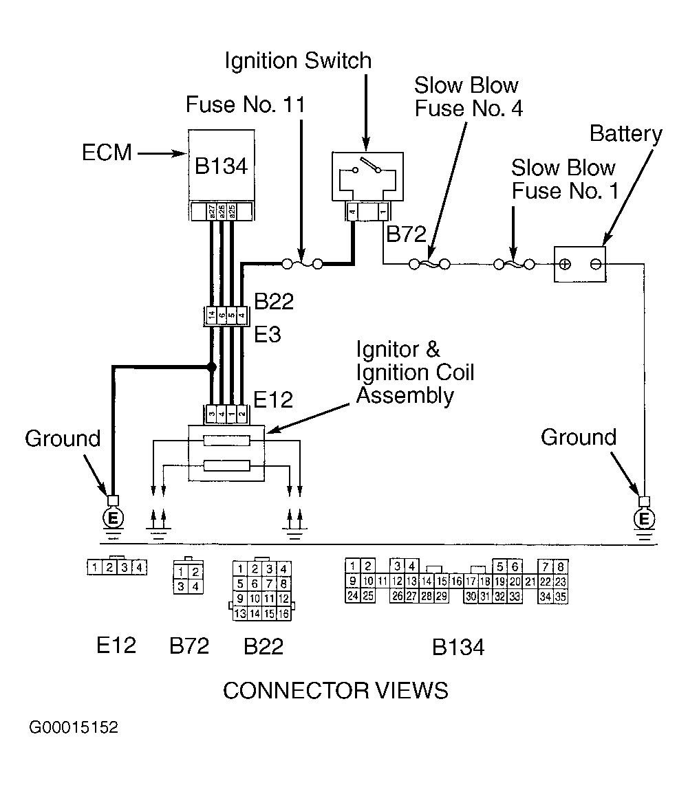 - Turn ignition off. Disconnect 35-pin ECM connector and 4-pin ignition coil and ignitor assembly connector. Using a DVOM, measure resistance between 35-pin ECM connector terminal No. 25 and 4-pin ignition coil and ignitor assembly connector terminal No. 1. Also measure resistance between 35-pin ECM connector terminal No. 26 and 4-pin ignition coil and ignitor assembly connector terminal No. 4. If resistance is less than one ohm for each circuit, go to next step. If resistance is not less than one ohm for each circuit, repair open circuit or poor connector contact in wiring harness between ECM and ignition coil and ignitor assembly.