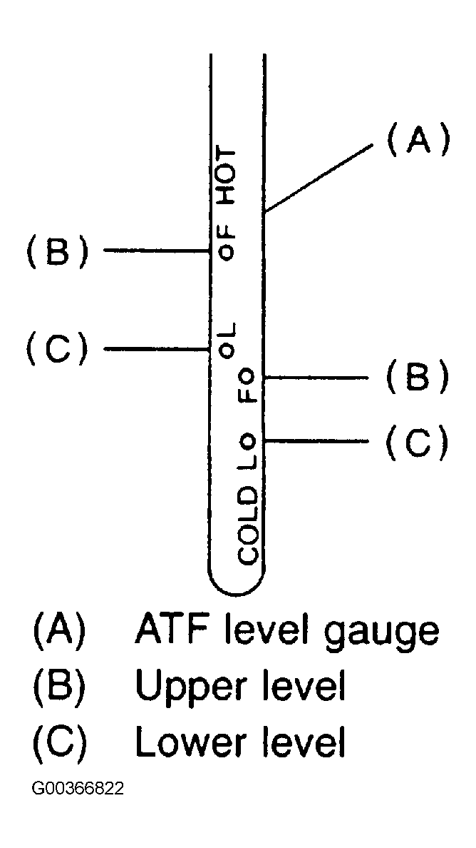 Park vehicle on level surface with engine off. Remove Yellow handled dipstick located on top of differential and clean with cloth. See Fig 1 . Check fluid level. Level should be between "C" and "B" marks. Add fluid if necessary.