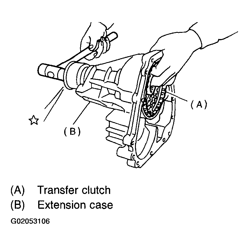 - Take out the transfer clutch by lightly tapping the end of the rear drive shaft. See Fig 1