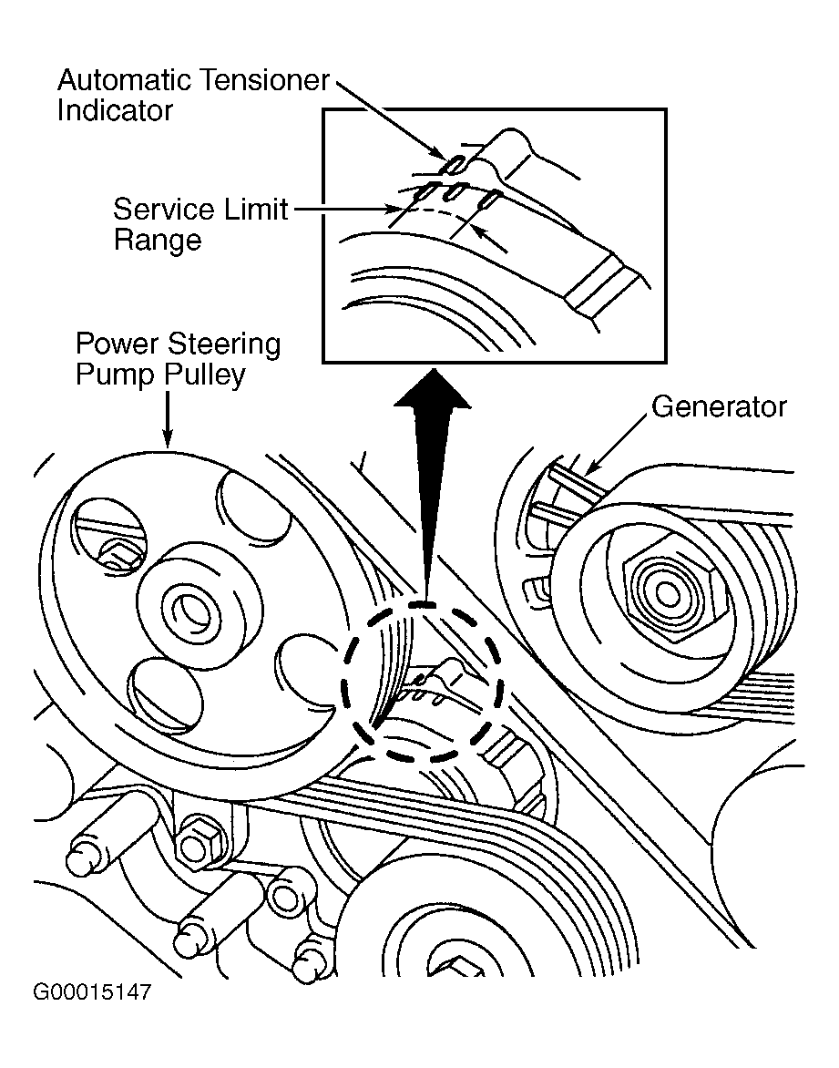(1) For Outback 3.0L, replace if automatic tensioner indicator is not within service limit range. See Fig 1 .