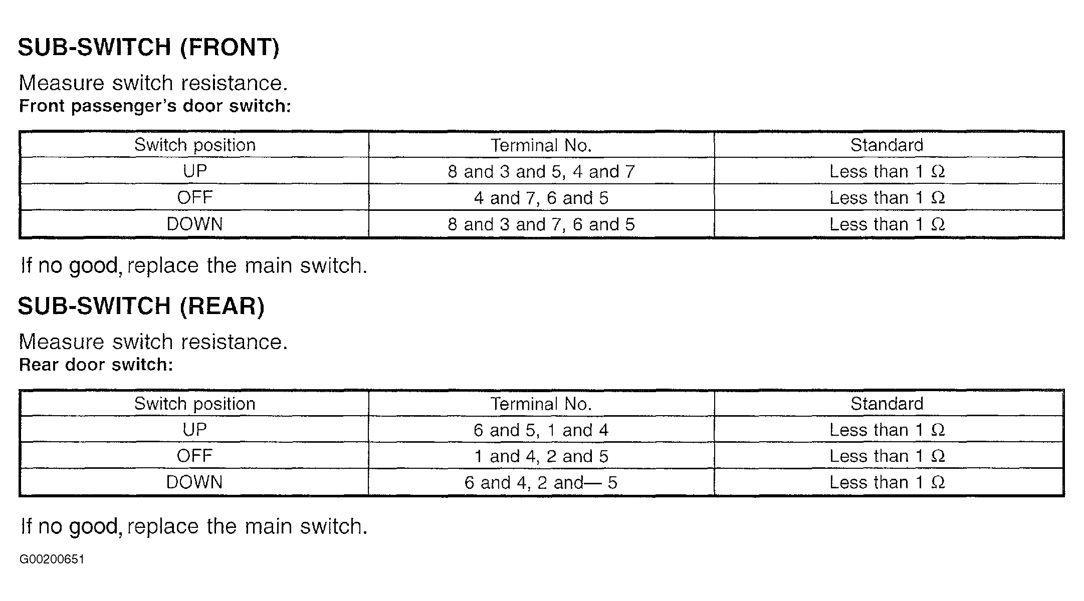 Remove power window sub-switch from door panel. Disconnect harness connector. Continuity should exist between specified switch terminals with switch in specified position. If continuity does not exist between specified terminals, replace power window sub-switch. See Fig 1 .