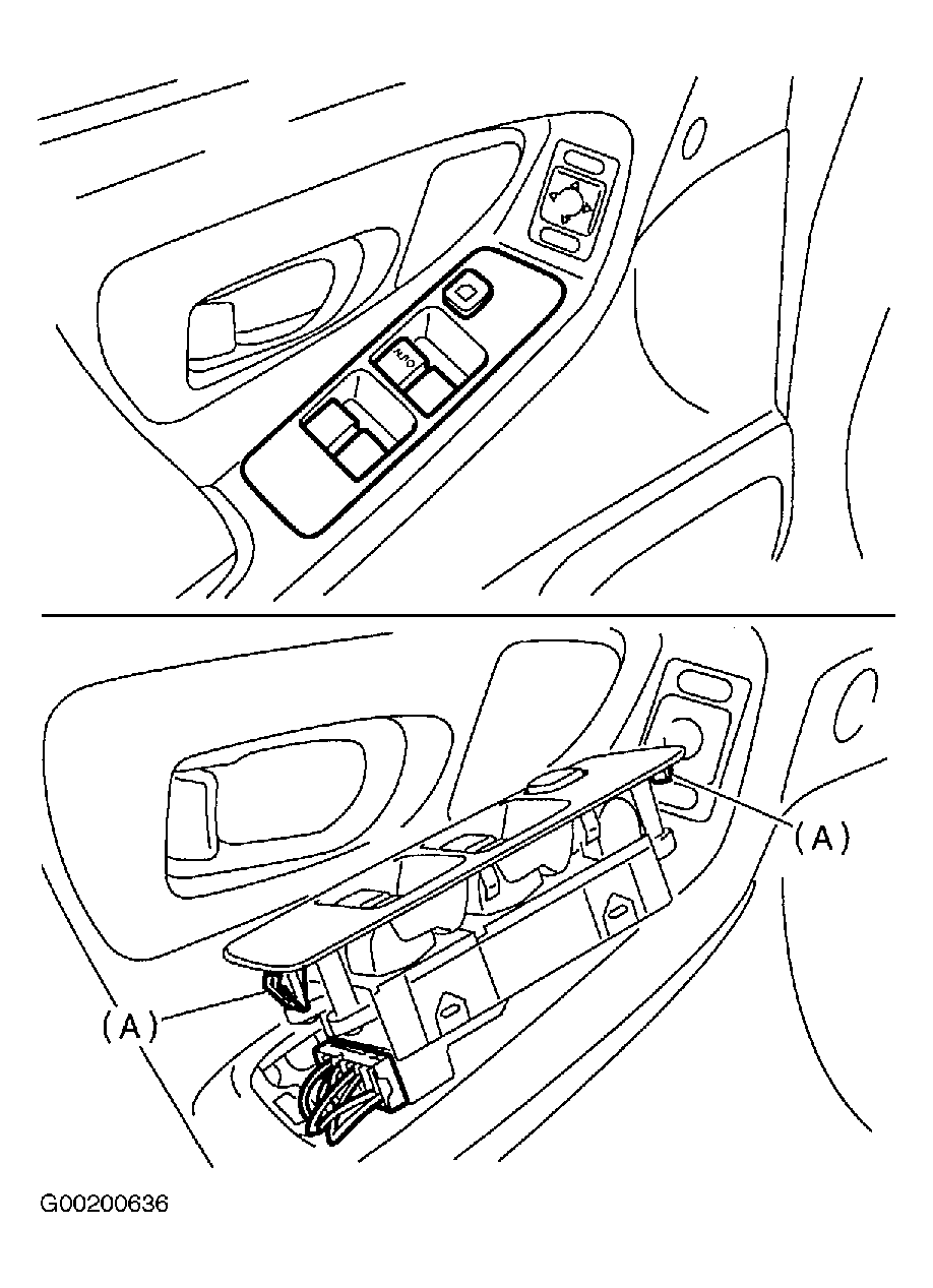 Release two switch panel hooks (A) to remove power window main switch. See
