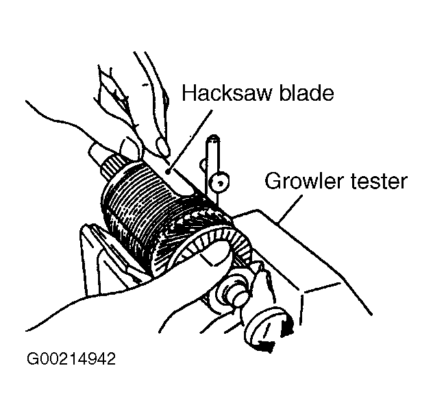 . Hold a iron sheet against armature core while slowly rotating armature. A short-circuited armature will cause the iron sheet to vibrate and to be attracted to core. If the iron sheet is attracted or vibrates, the armature, which is short-circuited, must be replaced or repaired.