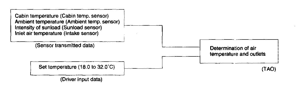 Upon reception of temperature set switch signals in addition to cabin temperature, ambient temperature and sunload sensor signals, the ECM calculates the TAO first and then, based on the calculated temperature, it determines the outlets from which the air is to be blown out.
