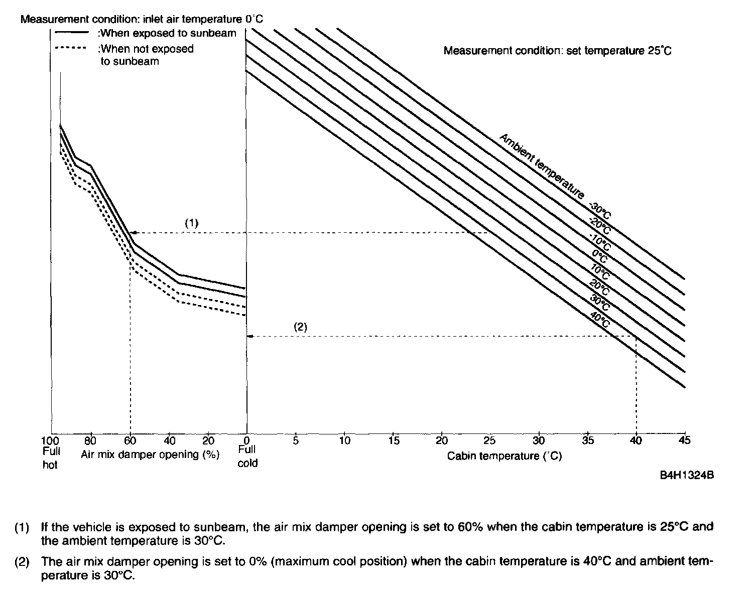 The air mix damper is moved fully to the HOT side and held there when the temperature set switch is placed at the FULL HOT position (32 °C), while it is moved fully to the COLD side and held there when the switch is placed at the FULL COLD position (18 °C).