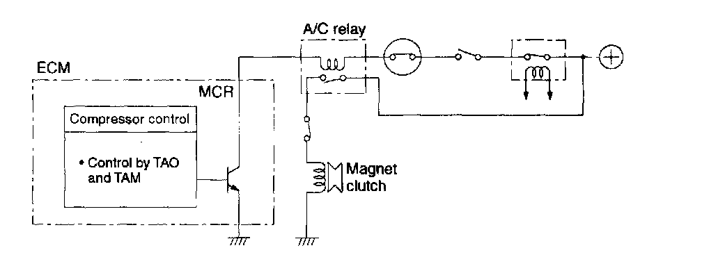 The compressor operation circuit supplies current to the magnet clutch as the ECM activates the A/C relay by connecting its coil to the ground.