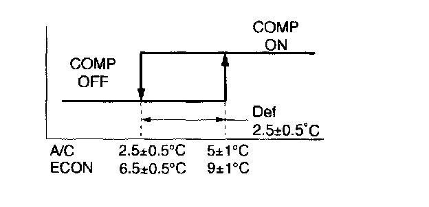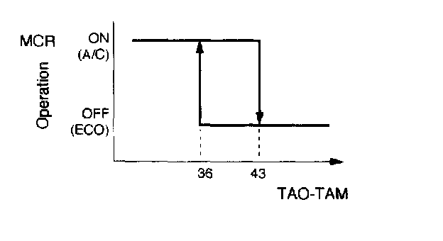 In the automatic air-conditioning mode, the A/C relay is activated or deactivated depending on the TAO (required blow-out air temperature), TAM (ambient temperature) and T INT (suction air temperature) to operate or stop the compressor.